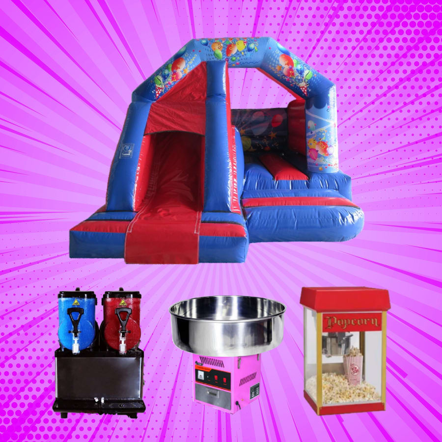 This package includes a combo castle and 1 fun food machine, choose from popcorn (40 servings), candyfloss (50 servings) or slush (100 servings).